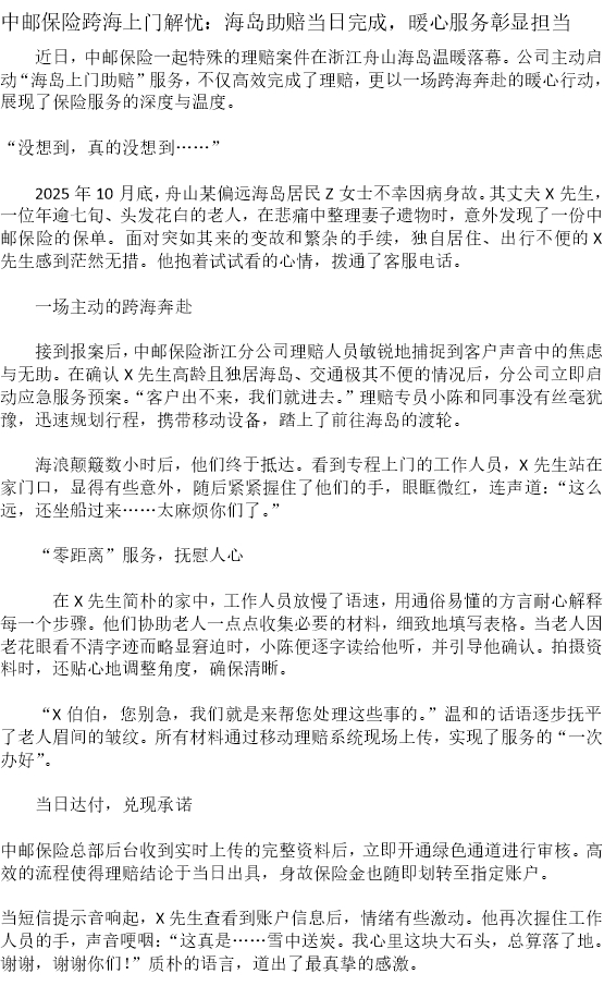 中邮保险跨海上门解忧:海岛助赔当日完成,暖心服务彰显担当